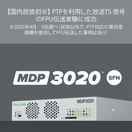 【国内民放初】 PTPを利用した放送TS 信号のFPU伝送実験に成功株式会社メディアリンクス(代表取締役社長 菅原司、本社:川崎市)、アストロデザイン株式会社(代表取締役社長 難波豊明、本社:東京都大田区)、株式会社国際電気(代表取締役社長執行役員 佐久間嘉一郎、本社:東京都 港区)、セイコーソリューションズ株式会社(代表取締役社長 関根淳、本社:千葉市)、株式会社毎日放送(代表取 締役社長 虫明洋一、本社:大阪市)は、2025年3月8日に、FPUによってPTP非対応の IP ネットワークを 構築し、PTPを利用した放送TS 信号を伝送する実験に成功しました。